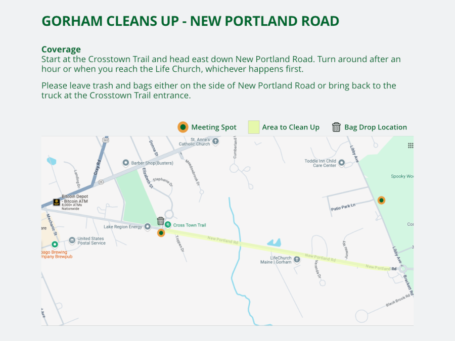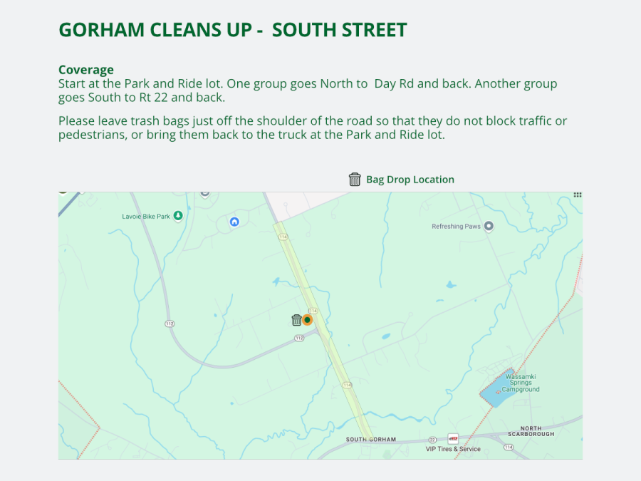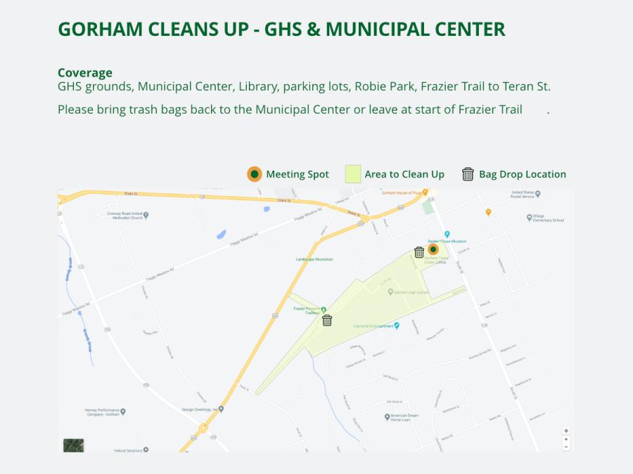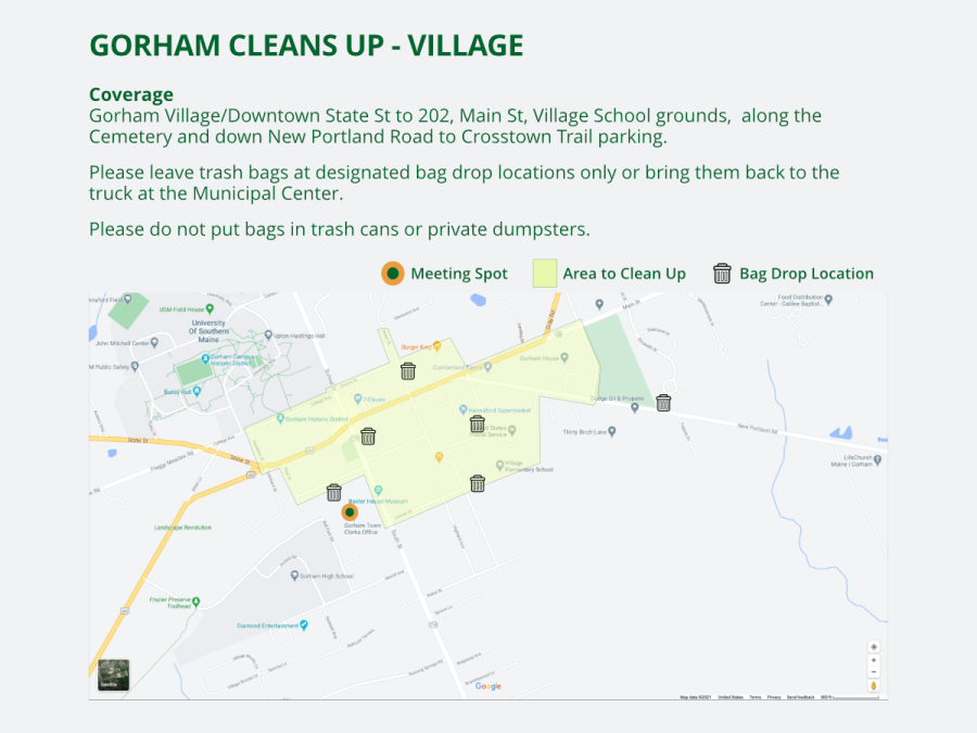 After a brief safety meeting, we will break up into groups to clean up around the Village, around GHS and Municipal Center grounds and parking lots, New Portland Road and South Street. Maps below show the areas we will cover and where trash bags can be left. (Please note: all trash bags eventually need to get back to the Municipal Center and we should NOT put any trash in private trash cans or dumpsters.)